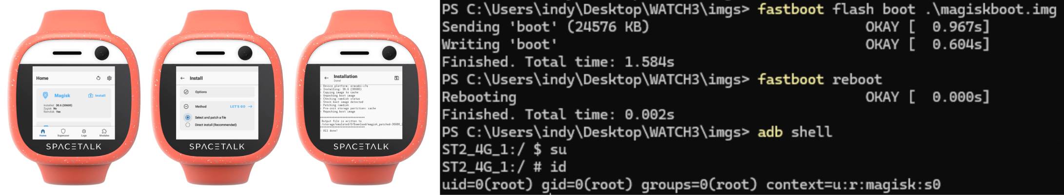 Cracking open system.img I pop some simple debug draws into init.rc's on early-init as a visual indicator to see if my backdoor worked. Using mtkclient again I reboot the watch to fastboot mode within the 2 second window, flash my custom image and boot.